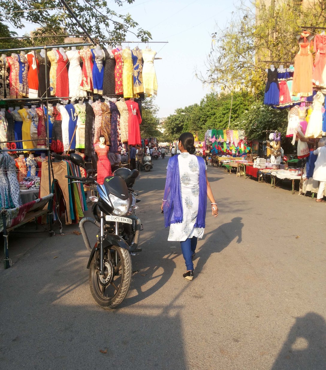 ‘Off with their heads!’ Shops in the Som Bazaar of Madhu Vihar in east Delhi. Vendors in these itinerant bazaars spend a long hours setting up their shops, some of which are quite elaborate, and carefully displaying their wares before opening for business. In the foreground is a shop whose frame is created by tying up aluminum poles from which mannequins are hung. Note the alternating colours of the kurtas.Mobile modern art. A vegetable vendor on his way to the Som Bazaar. His thela is used both for transporting his wares and as his shop at the bazaar site. I love the abstract painting on his thela.Red is not a colour. A jamun seller walking through the lanes of Kailash Colony. Note the contrast between the red tarpaulin and the jamuns, and the lovely design created using green leaves and white champas. Photograph courtesy of Misha Oberoi.Galactic hotdogs. An unusually shaped thela selling hotdogs stuffed with mashed potato and paneer and served with fiery green chutney. The vendor got the thela made in this particular design and was planning to get it repainted before Diwali. Photograph courtesy of Sarover Zaidi.The heart of the matter. When a friend and I first passed by this vendor, the rose petals were scattered on the peas. On our way back, we saw that they had been transformed into a heart with an arrow. He smiled when we told him that his shirt was matching his peas and then blushed shyly when we asked, ‘Kya ho gaya bhaiyya sab theek toh hai’ (What happened, all well?’), referring to the heart. Photograph courtesy of Sarover Zaidi.Body shop. A vendor selling earrings in the Bhogal Mangal Bazaar. His shop comprises of two boards hanging from his neck. He moves through the bazaar and stops at different points. He balances the boards while holding a battery-operated light in one hand and using the other hand to pack earrings for his customers.The chatter shop. Vendor selling paan and cigarettes in the New Friends Colony Community Centre. He starts business at seven in the evening and is open till four in the morning. He moves close to the adjacent Surya Hotel after the market closes, catering to late-night clubbers. He sells chai during the winter months, providing succour to people in late-night ATM queues. He loves this market because people stop by to chat with him, but I think customers are attracted as much by his stories.