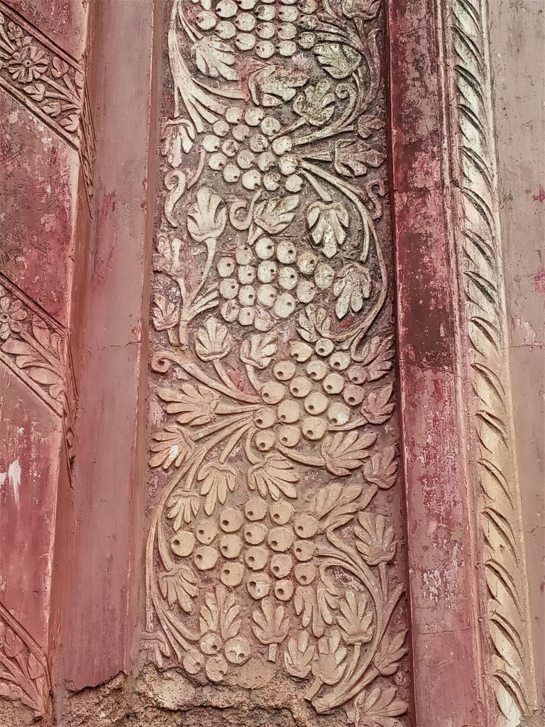 The shrines dedicated to Imam Ali, Hazrat-i Abbas and Imam Hussain on the road to Karbala were also constructed in this period. These shrines stand out for their design. With their flanking minars, chamfered edges of inner chambers and monumental pishtaqs,8 they replicate the shrines in Najaf and Karbala. This was in keeping with Amir al-Daulah’s travel to Iraq in 1888 and the ties forged between the rajas of Mahmudabad and the ulama (scholars) of the holy shrine cities of Iraq. As one of his descendants, the scholar Ali Khan Mahmudabad, puts it, the family, and indeed Mahmudabad, emerged as a ‘local node in a transnational network’ across the Islamic world.9 This locatedness is also visible in the architecture of the shrines—Mahmudabad’s artisans freely decorated the Iraqi replicas with Awadhi stucco and sgraffito, and as a result, localized grand designs. Amir al-Daulah’s period was certainly not the originary moment in the history of the qasbah or its aristocracy, but clearly much of what we have in terms of architectural investments dates back to it.