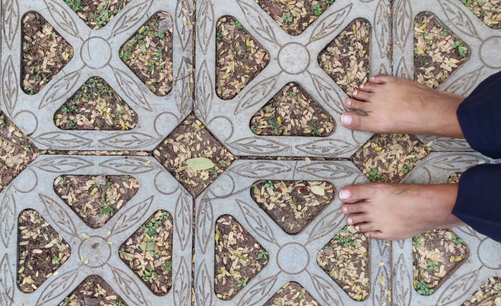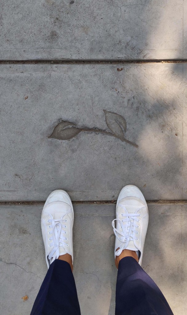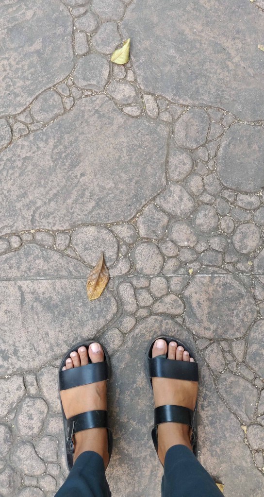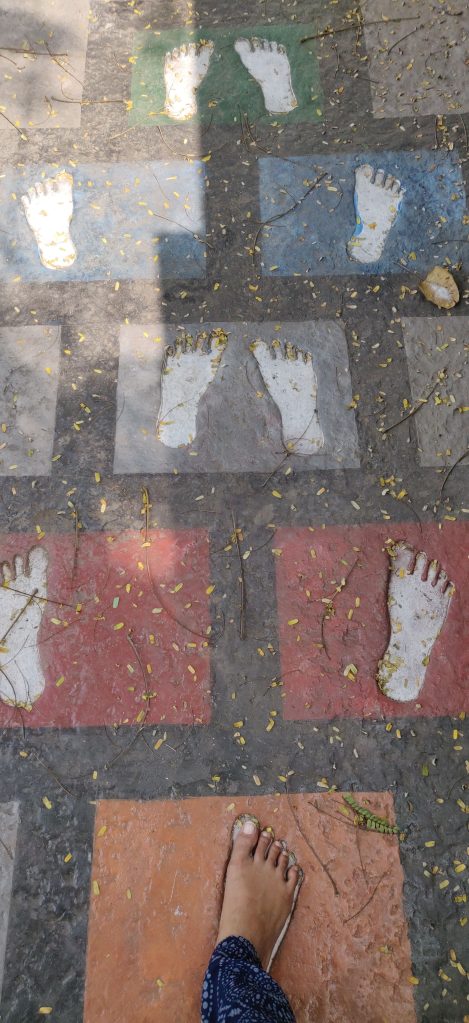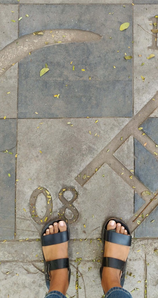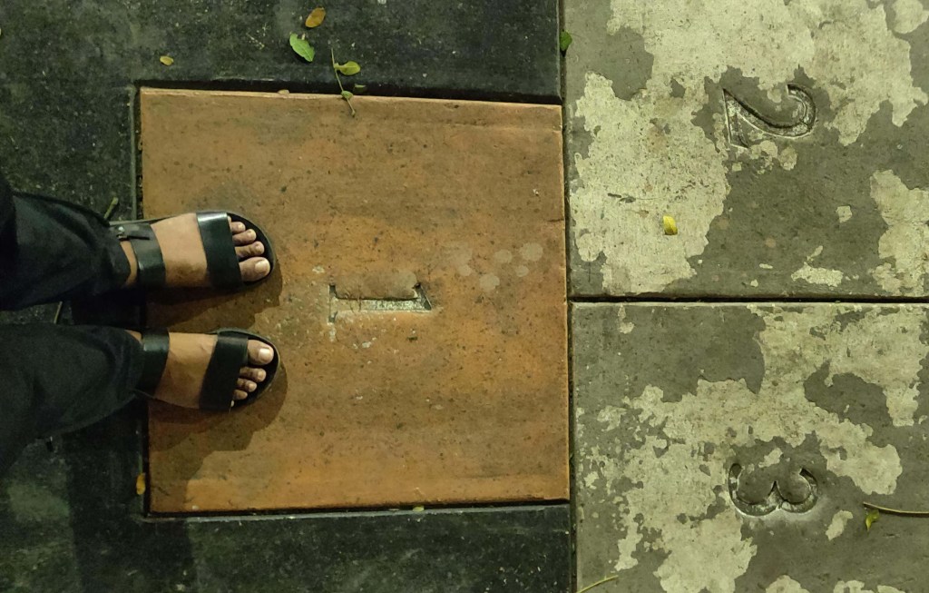 I can barely listen to the steady beats of my footsteps against the cacophony of moving vehicles, blaring horns and construction work. But then, I chance upon a street where I can see them! Every time I’m on this street, my foot inadvertently approaches these blocks of palm and foot, trying to fit my own in these permanent moulds. These childish, repetitive attempts turn my rhythm of walking into a play, with the feet flying, hobbling and limping through this peripatetic stretch. By the tenth visit to this street, my walk has learnt to tune out these visual notes to the kinetic music of footsteps. I simply whizz past, with these designs and patterns blurring in the background.