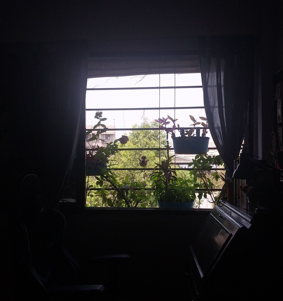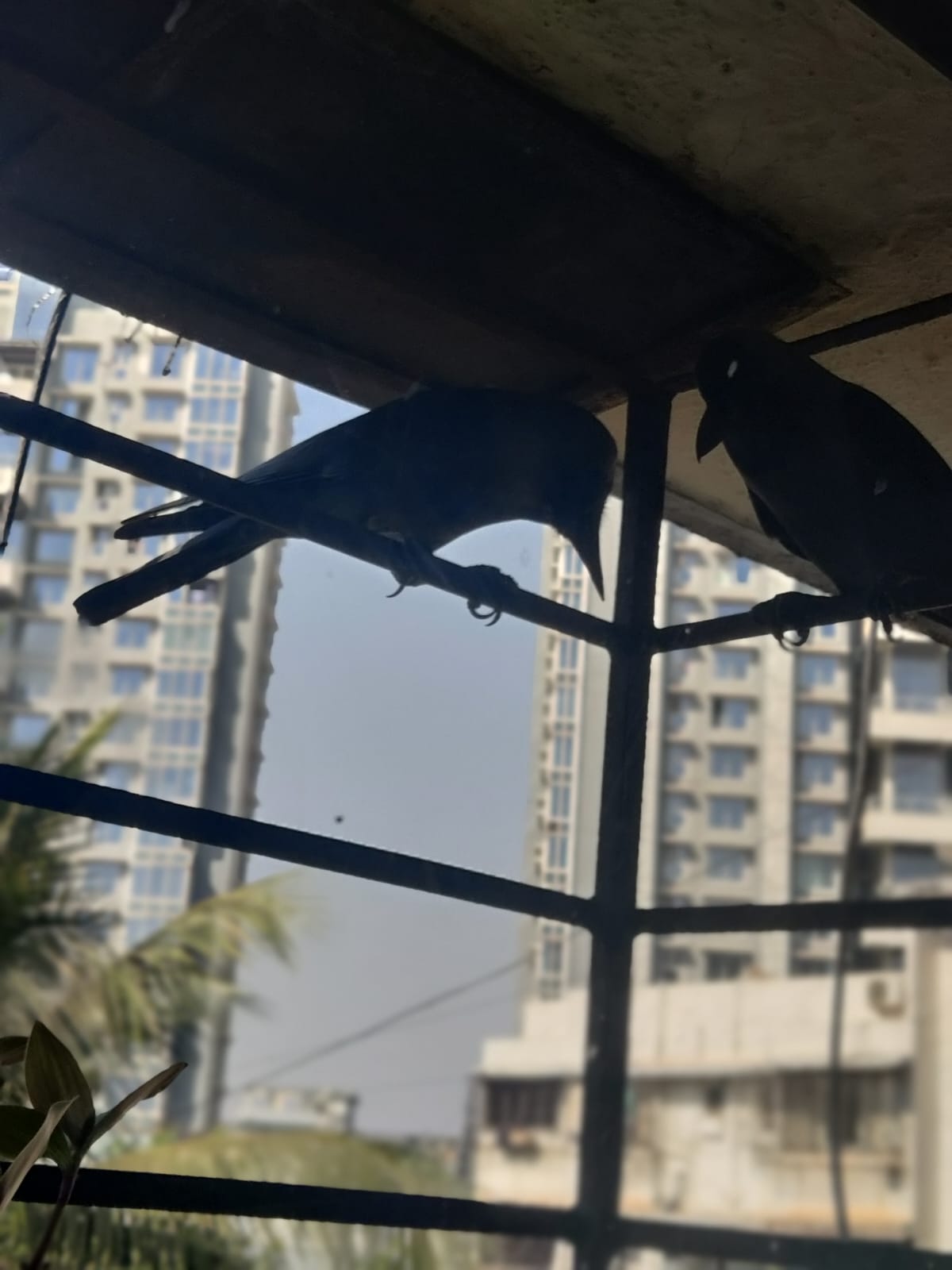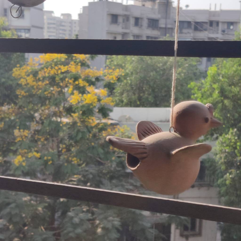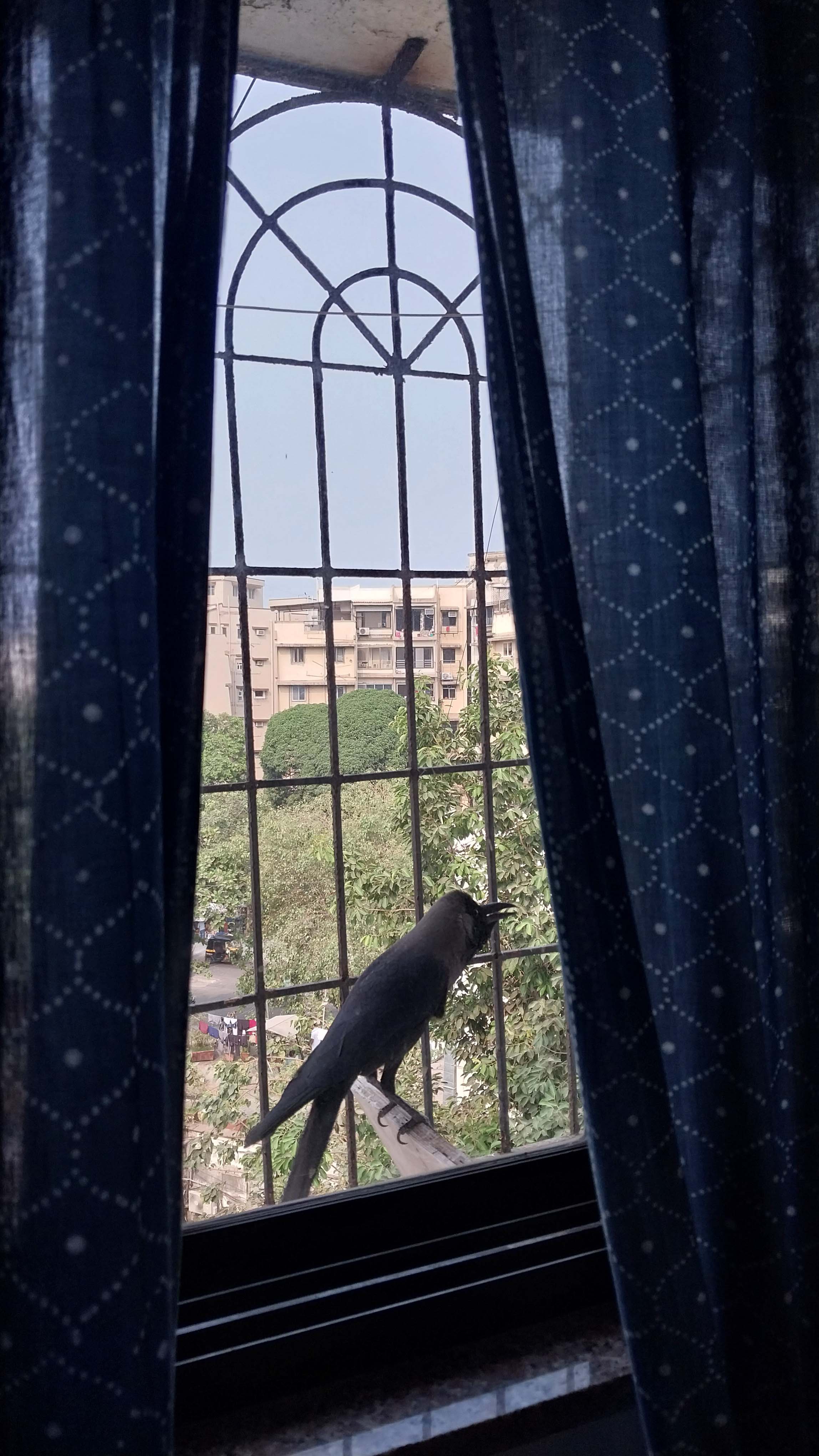 I brush my teeth watching the moving silhouette of two pigeons, grunting and hopping outside the closed slats of the bathroom window. From beyond the window, somewhere a magpie robin is singing a beautifully haunting bird song. In a corner of the window grill in the living room, an out-of-tune crow practises singing for hours at end, getting more and more distraught about not making any improvement. In some time, he is joined by another who soothes him by pecking his neck. A host of sparrows hop around, flitting away and back, around the kitchen window, even as there aren’t any plants on the sill, nor any food or water that I leave for them. A pair of sunbirds dart in and out of the window grill outside the bedroom, piercing all other surrounding sounds with their shrill ‘chwing, chwing’. They have a love for the hibiscus flowers from which they hang upside down. A sparrow is carrying away bits of my monstera’s moss stick to make a nest. A red-vented bulbul comes to check if my partner is at his writing, scolds him loudly because he’s not, and flies away. Every new bird I see or hear from my windows delightfully pokes holes in one of many clichés that I construct about the city—that the city is only habitable for crows and pigeons.