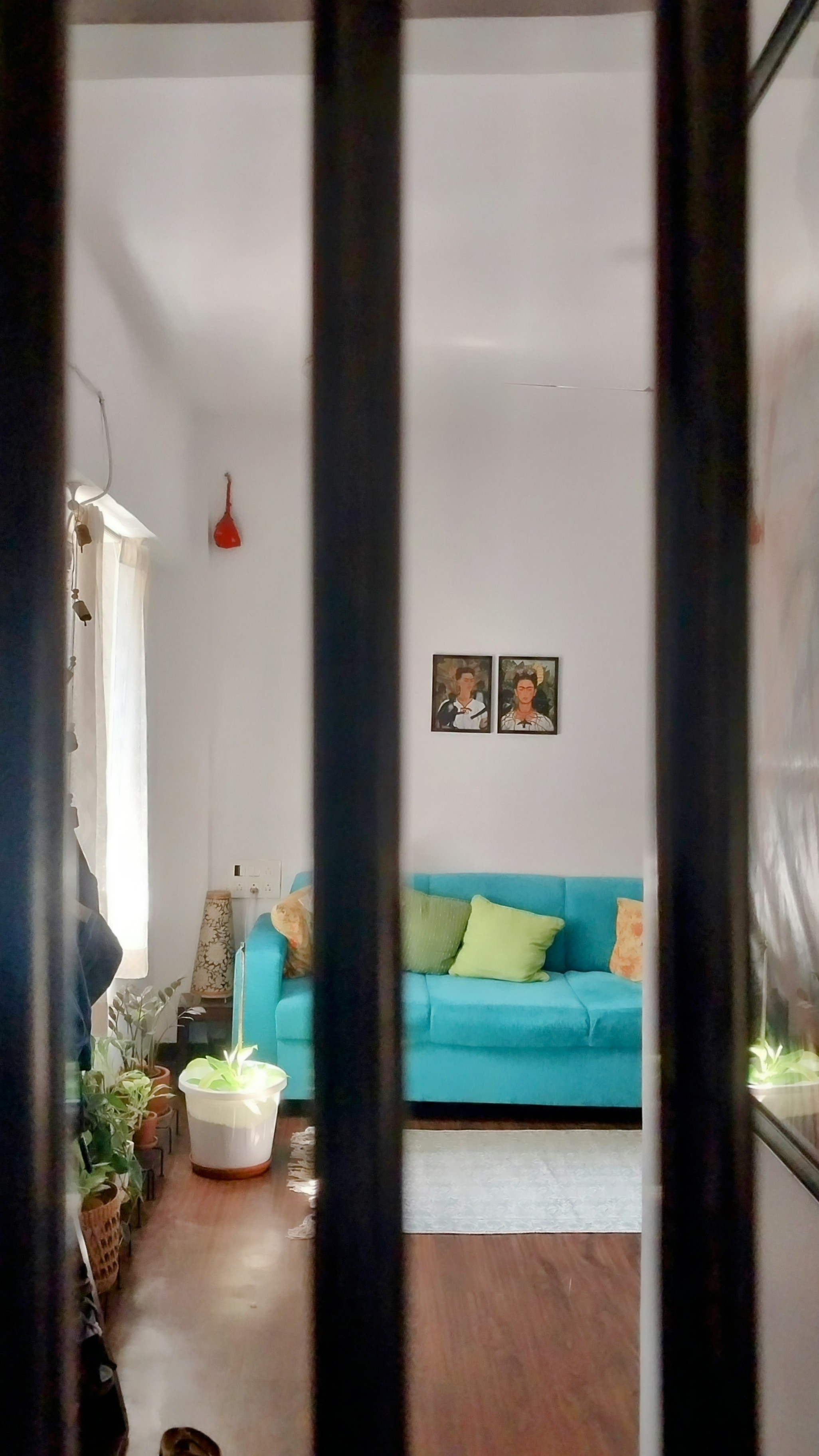 She is stepping out of the house for a quick run to the grocery store. She decides to leave the inside door open and pulls shut only the outside door. Standing outside, she peeps in through the little window with bars on the outer door. She is not inside the house. But she thinks, ‘This is a house I could live in.’