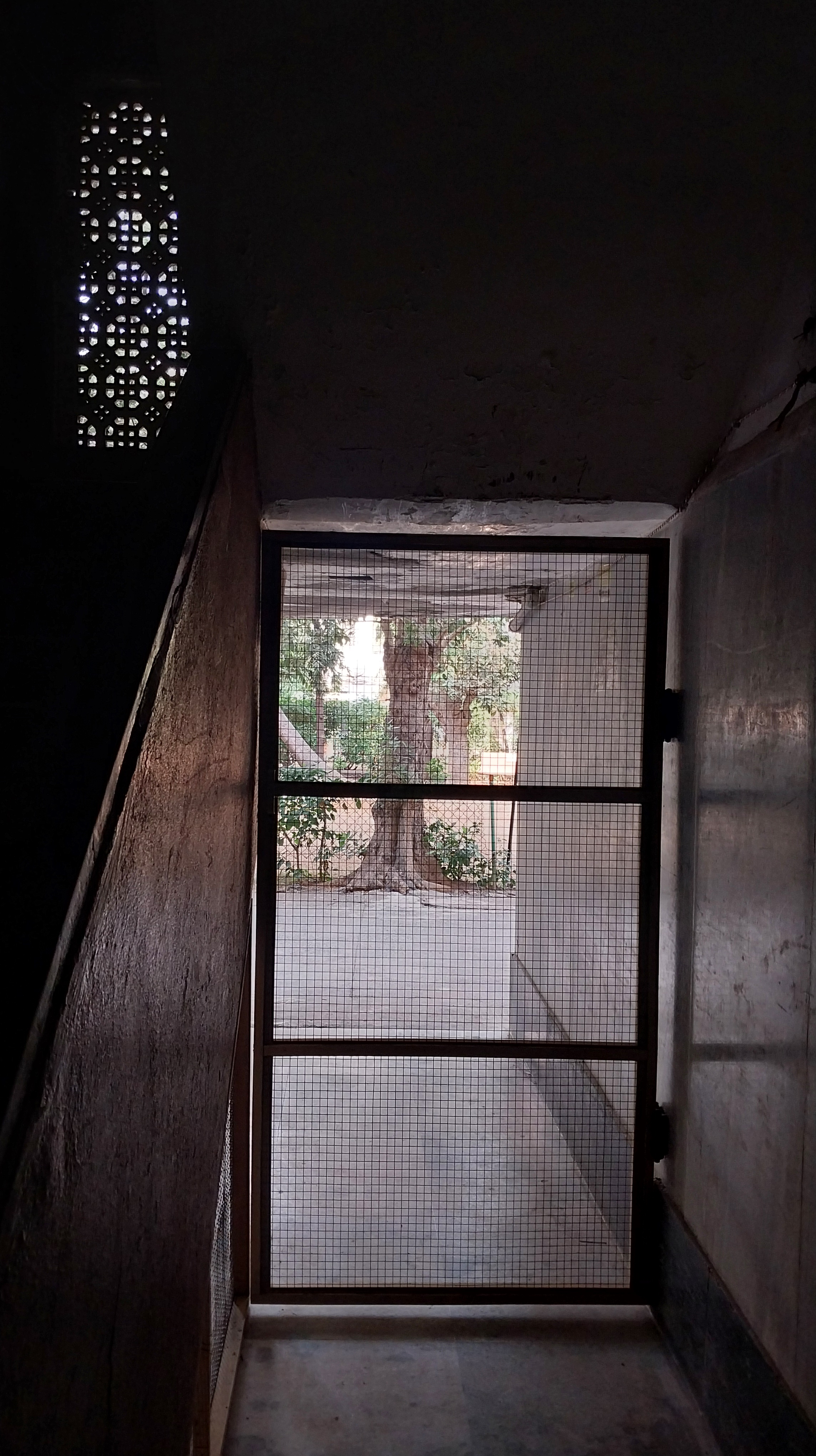 There is a window that lives in a door. This door is the outside door. Behind it is the inside door. When the inside door is open and the outside one closed, this window carries the breeze from the jaali in the staircase landing into the house. This breeze mixes up with the breeze coming from the windows in the house, the ones that live in the walls of the house.