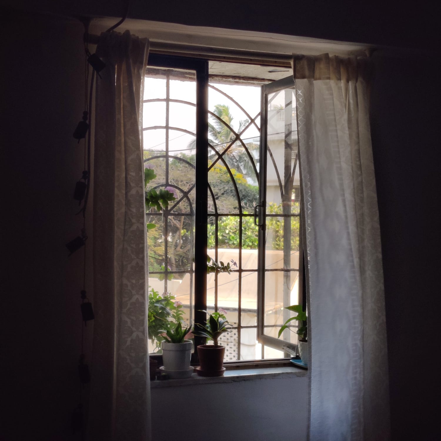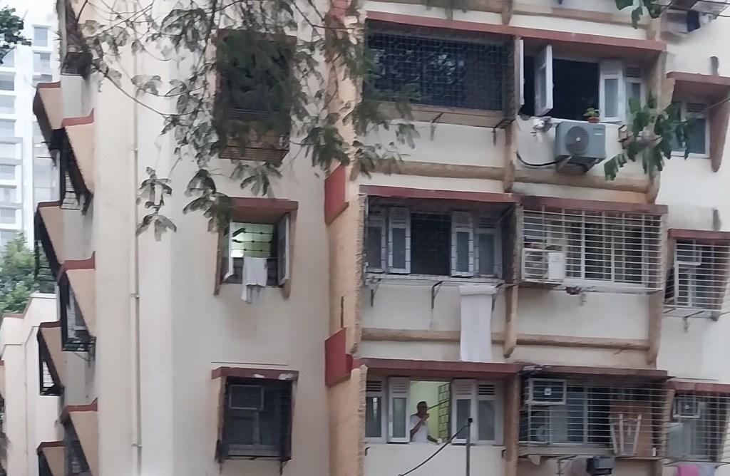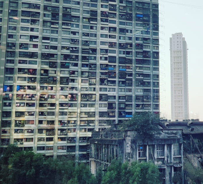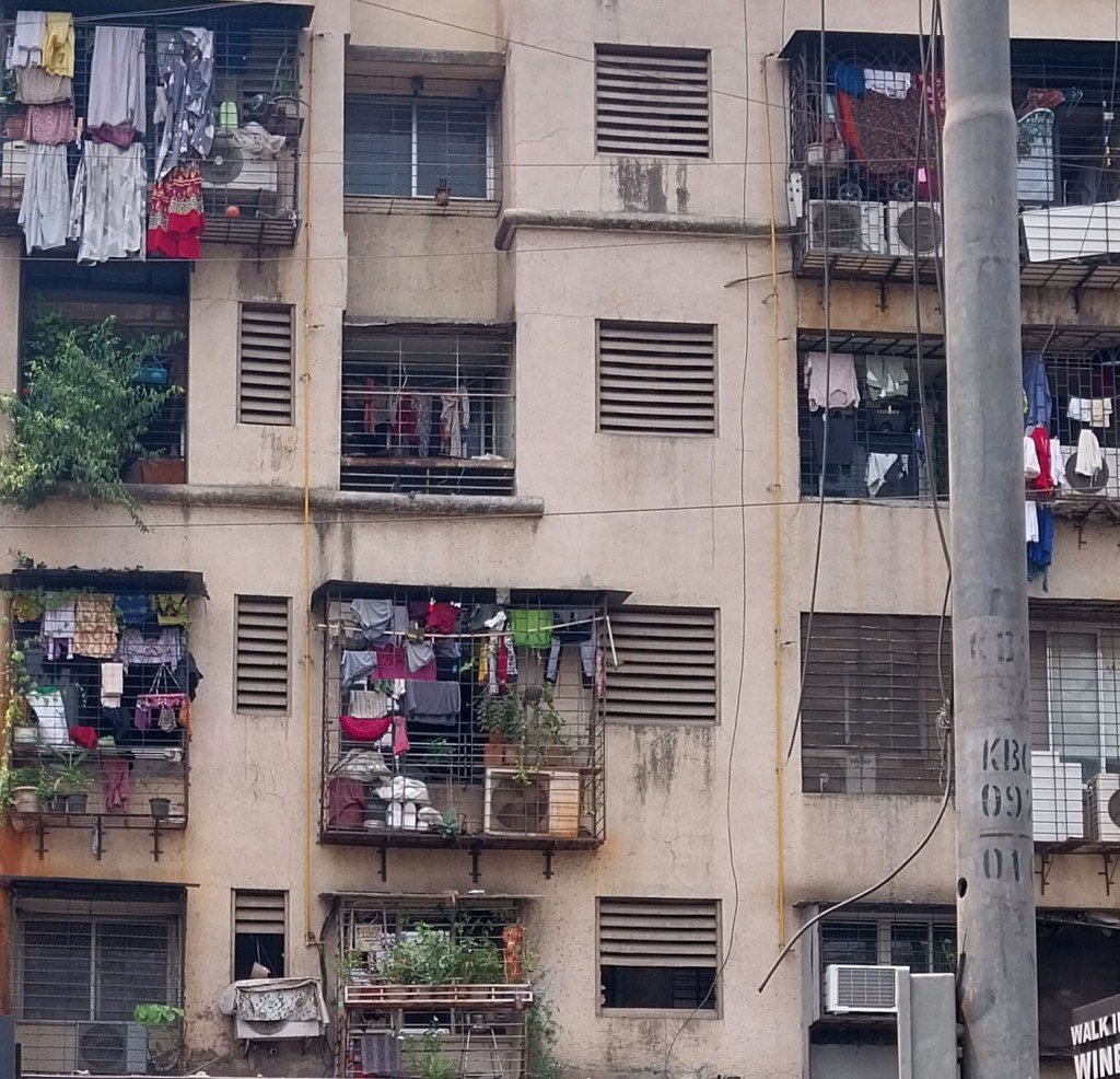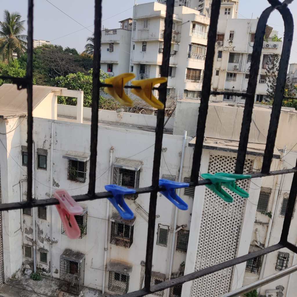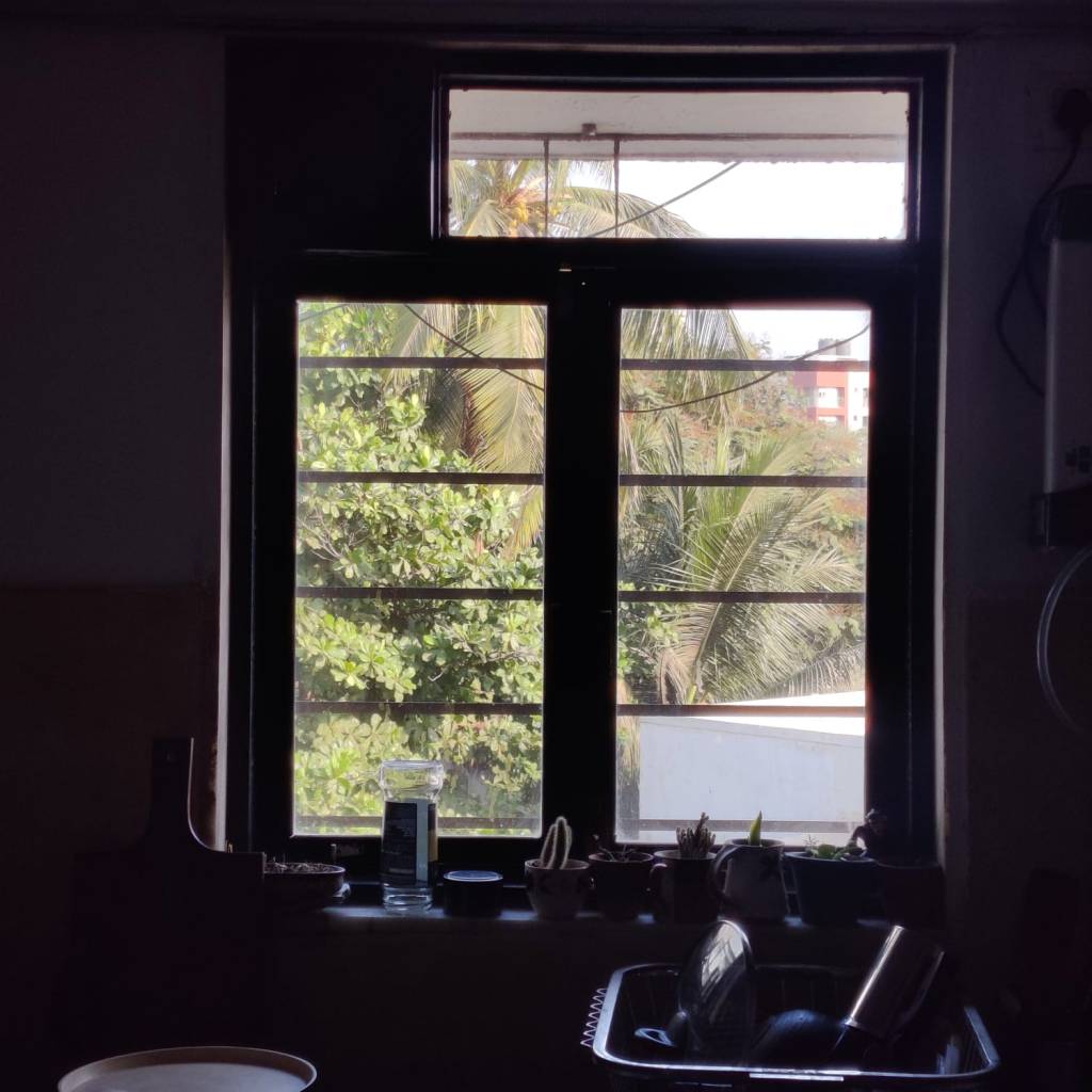 I stand behind different windows in the house at different times of the day, and look out at various people and activities. Those within my apartment complex: children racing bicycles, the kudawala sorting the day’s waste, a coconut plucker on a tree right outside the window of my apartment, a young woman walking her cat on the opposite terrace, old women sitting in weather-worn benches in the dusty patch which once might have been a lawn, the ‘crazy’ uncle who is holding out against redevelopment, laughing and talking loudly with his friends. The street outside: the vada pau seller in the street corner, who I don’t quite see but know has started his day because I can see the top of the bright-red umbrella covering of his stall and the cluster of autorickshawalas around it. The windows of other apartments that surround me: someone watering plants, someone doing yoga in their living room, construction workers perched precariously on new building towers in progress. Every sight framed by these slightly ugly, often dirty, and always malfunctioning windows of mine opens a window into this new city I have no intention of living in for too long and which, I tell myself, I will not burden myself with loving. Each window grounds my feet and chips away, bit by bit, the jagged judgment I hold towards something not entirely familiar and not quite home. When I look keenly at the all-glass façade of a newly redeveloped building in which I’ve never sighted people and then see a red chaddi and a faded bedsheet hanging from a window, the banality of this sight makes the intensity of my disdain at the ugly, shiny building somewhat ebb away.