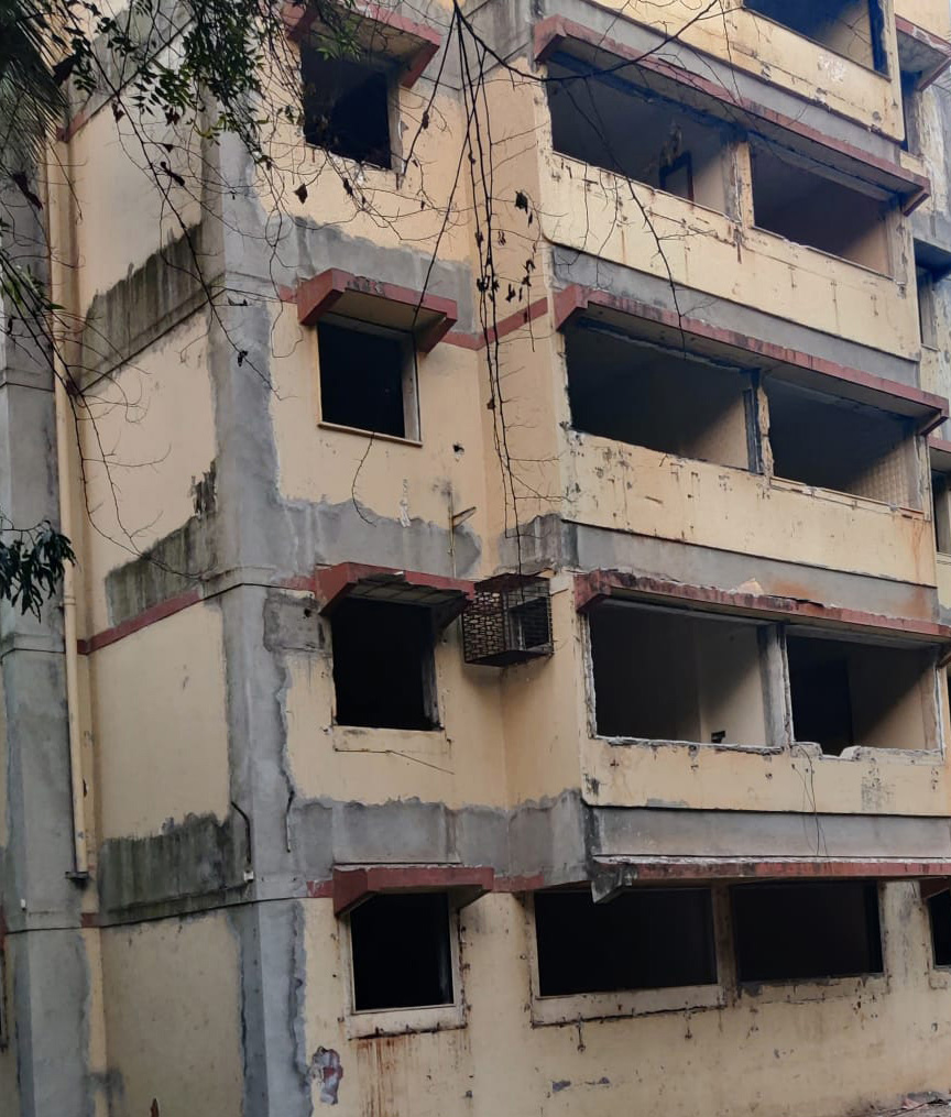 When a building goes into redevelopment, first, the objects on the window grills disappear, and then, the windows themselves. Till before the building disappears, it looks like its eyes have been gouged out. It’s still looking out but can’t see a thing.