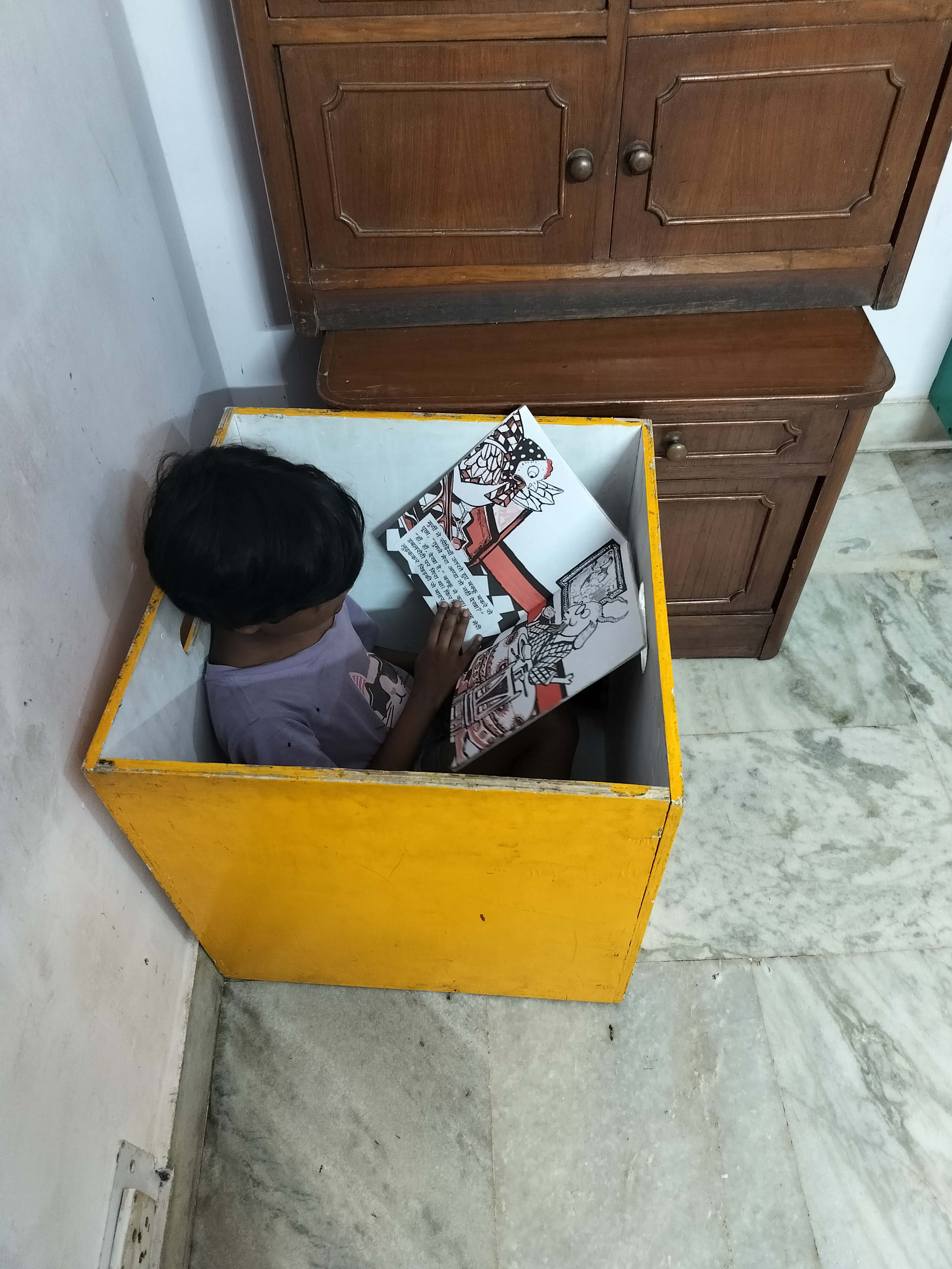 In another room, there is a collection of books, vividly colourful ones. There are mostly picture books—English, Hindi, bilingual, and wordless, fiction and non-fiction, comics, poetry, magazines, plays, novels, award-winning books, handmade books, and, the children’s most favourite kind, fairy tales. Some of the shelves are theatre boxes—wooden blocks that double up to make set pieces, seating, props, and storage. Some wooden boxes are the favourite reading nooks of the smaller children.