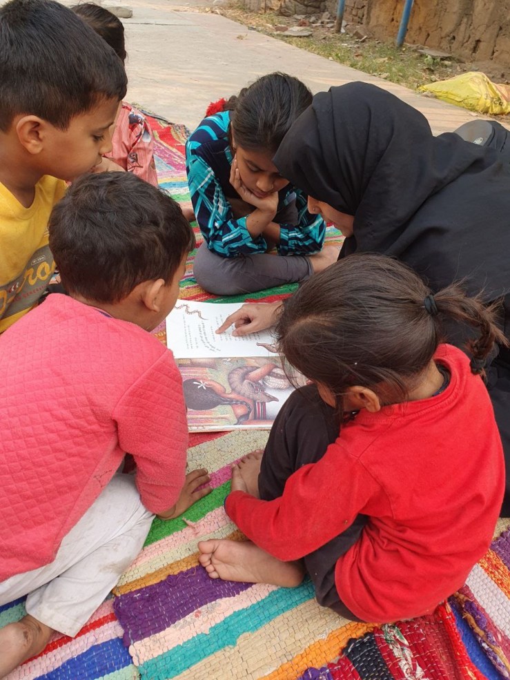 For instance, the majority of the Basti’s residents migrate seasonally. So around September, many people return to their villages. During one of these times, the theme of our open library was ‘going home and returning’. We looked at a picture book from the 1980s called My First Train Journey, and one room was converted into a train compartment, complete with running scenery projected on the wall. Each child was given a train ticket when they entered the library. A stern ticket collector (in full costume) checked the children’s tickets before they entered the ‘train room’. A ‘chai-seller’ burst into the room and distributed Rooh Afza in a kettle at some point. The library was decorated with a train of books each of which showed different types of journeys. One room had a dynamic movement and imagination game where people recreated their journeys to the village and then back to the city.