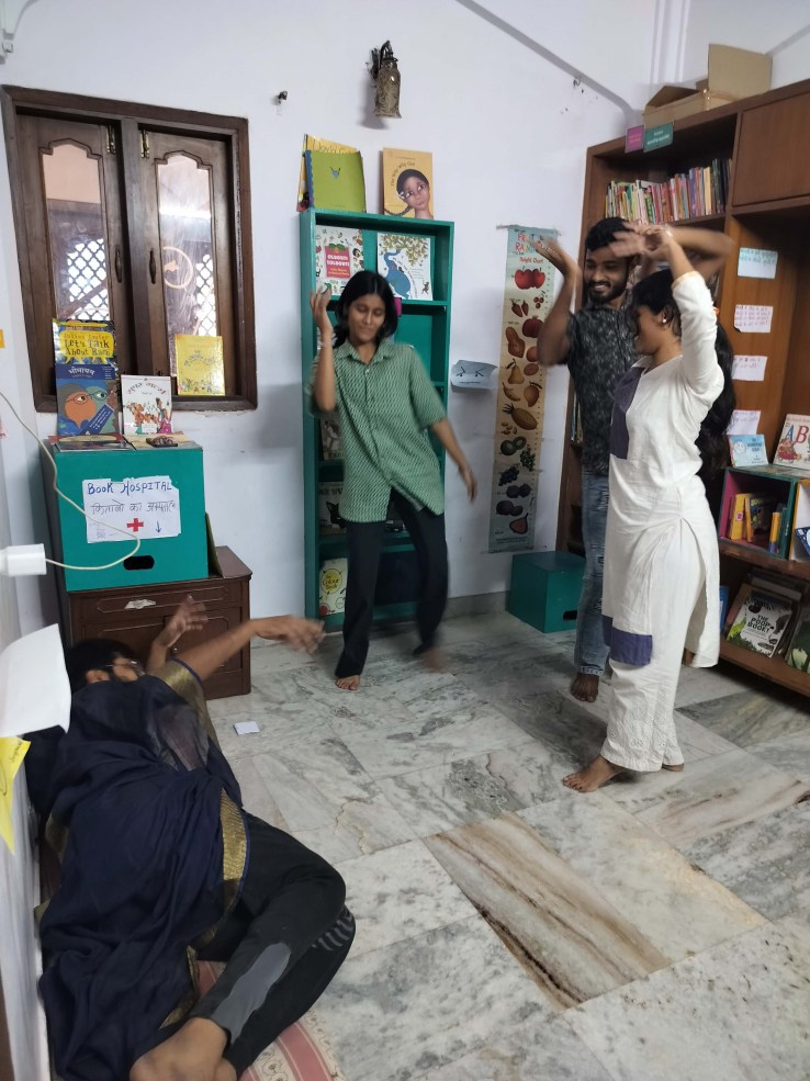 Our library has featured, at different times, an ER for damaged books with emergency repair ’surgery’ by ‘book doctors’, Charlie Chaplin film screenings with all the facilitators as clowns, a Halloween library special with ghost stories and all the facilitators as ghosts and monsters, the nine rasaas personified (sorrow, love, peace, rage, delight, disgust, wonder, fear, and bravery) through different books, a Khwāb Ghar ka Nehru writing letters to the children and leaving them new books, a rogue Santa Claus holding a dance party, and an election campaign.