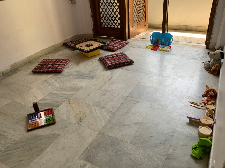 One room has a serious carrom game in progress, with multiple players lining up for their turns. In the same room, children are twirling, walking on their hands, chasing each other, throwing and catching balls, hiding in boxes, doing stray homework, or just sitting and enjoying a chat.